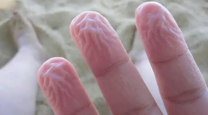 Кожа на кончиках пальцев становится от воды разбухшей и ребристой. Это происходит не просто так: в условиях повышенной влажности тело понимает, что тут может быть скользко и трансформирует кончики пальцев повышая сцепление кожи с поверхностью.