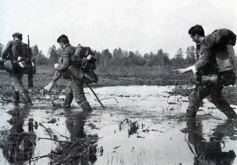 Солдаты группы армии "Север" в болотистой местности Новгородской области
