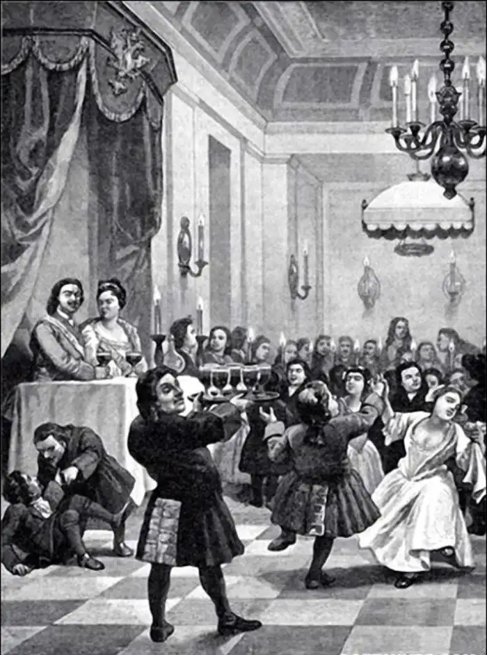 Так, в 1700 году Пётр I, лично сосватав дьячиху, велел сыграть шутовскую свадьбу своему шуту — Якову Тургеневу, «знатному воину и киевскому полковнику». Эта свадьба сопровождалась большим количеством насмешек над старыми обычаями. Сам же царь в форме морского офицера принял непосредственное участие в постриге бород именитым боярам и отрезании рукавов и подолов боярских кафтанов.