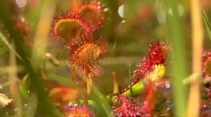 Листья росянки стелются по земле. Это и есть приманка: тончайшие волоски растения выделяют липкий сок, он же фермент для переваривания добычи. Жертва прилипает к ловушке намертво и росянка начинает поедать ее заживо, одновременно скручивая вокруг тела листок. Обычно росянка обходится насекомыми, но в ловушку особо крупных экземпляров иногда попадают и лягушата.