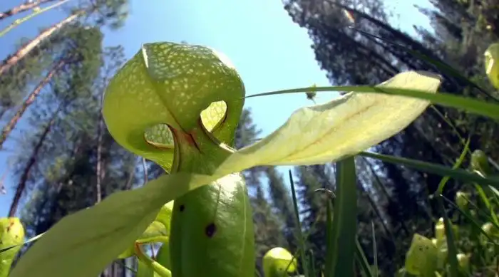 Еще один болотный хищник, цветок которого напоминает готовую к броску кобру — в некоторых регионах дарлингтонию так и зовут растением-коброй. Завлеченная приятным ароматом добыча (от насекомых до крохотных колибри) проползают внутрь бутона. Там они и находят свое последнее пристанище.
