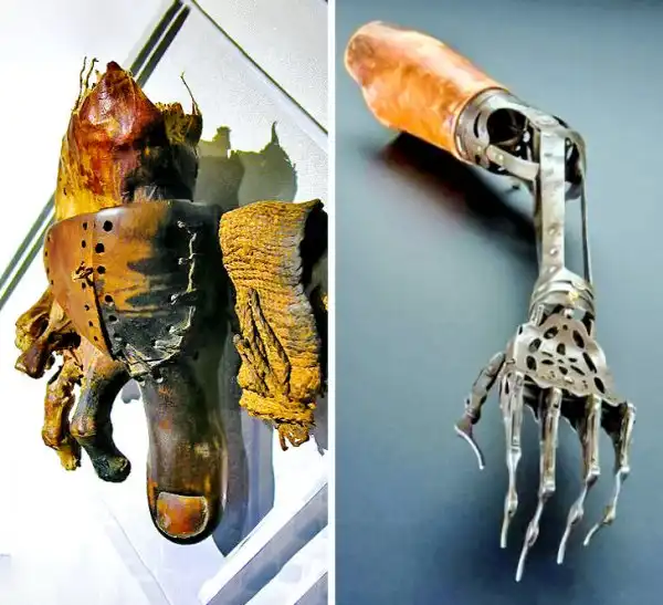 Протезирование было изобретено еще до нашей эры. К примеру, на первой фотографии как раз запечатлен древнеегипетский протез большого пальца ноги, а вот на втором снимке показан протез из латуни, сделанный в 1890-х годах.