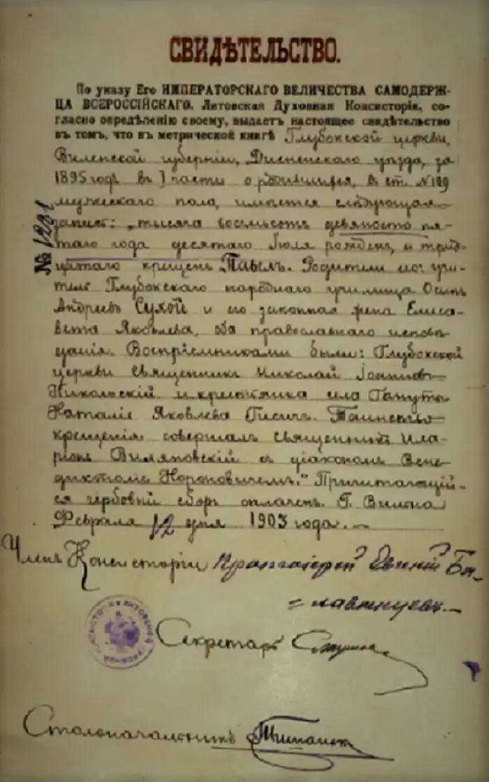 Свидетельство о рождении и крещении Павла Сухого из Метрической книги Глубокской православной церкви.