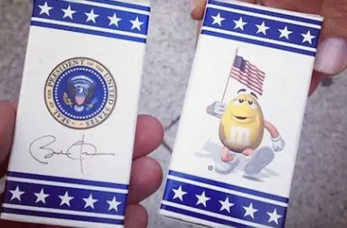 Любовь к этим шоколадным конфетам питал Рональд Рейган, именно с его легкой руки M&M’S стали появляться всюду в Белом доме. До этого президенты Америки могли при встрече с посетителями протянуть коробок фирменных спичек или пачку сигарет, когда Рейган возглавил Америку, в качестве сувениров стали выдавать коробочки с драже M&M’S. Традиция продолжается и по сей день, на коробочках конфет даже можно увидеть президентскую подпись.