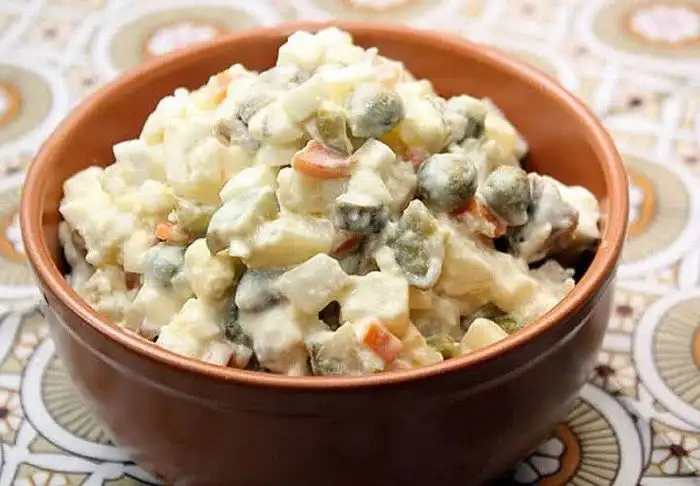 Возможно, он шокирует тех, кто никогда не был в России, но это просто картофельный салат, приправленный большим количеством овощей и вышеупомянутой колбасой. Выглядит странно, но вообще он вкусный.