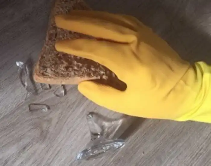 Что делать, если разбил стекло, не всегда понятно. Крупные осколки не проблема собрать рукой, а вот с мелкими – возникают сложности. Ведь убрать нужно так, чтобы не порезаться. Тряпкой или веником – не выход, при последующем мытье крохотный осколок можно загнать под кожу. Выход есть. Попробуйте «промокнуть» осколки кусочком хлеба, и за считанные секунды безопасно проведете уборку.