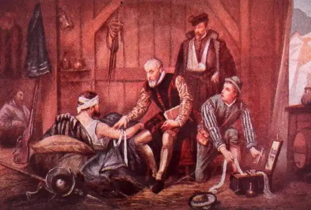 В XVI веке медицина значительно шагнула вперед. Прежде всего, благодаря талантливому французскому военному хирургу Амбруазу Парэ, который первым стал использовать новые заживляющие вещества. Вместо кипящего масла в рану стала заливаться холодная смесь из яичного белка, розового и терпентинового масла. Такая субстанция не причиняла ожогов и приводила к более быстрому выздоровлению. Помимо лекарств появились более современные щипцы и ножи, способные аккуратней доставать поражающие предметы. Для сшивания краев раны использовали нитяный шов.