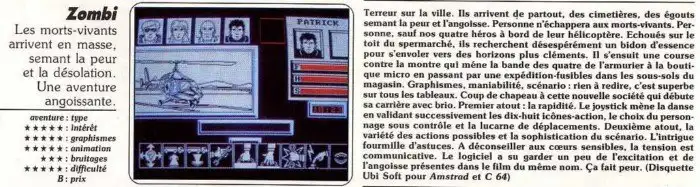 Спустя полгода Ubisoft получают Zombi – свою первую собственную видеоигру. Это была point-and-click адвенчура, вдохновлённая фильмами Джорджа Ромеро – родоначальника фильмов о зомби, поэтому сюжетная фабула игры не далеко ушла от классики зомби-кинематографа. Четверо выживших после зомбиапокалипсиса ищут топливо для спасательного вертолёта и проникают в заполненный ходячими мертвецами супермаркет.