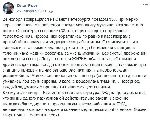 К сожалению, довольно редко можно увидеть слова похвалы в сторону РЖД. Но произошедший на днях случай, который был описан одним из пассажиров поезда, действительно достоин вашего внимания. Железнодорожники смогли сделать всё, что от них зависело, для спасения жизни человеку.