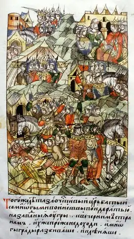 битва русских с монголами, примечательно что и одни и другие одинаковы.