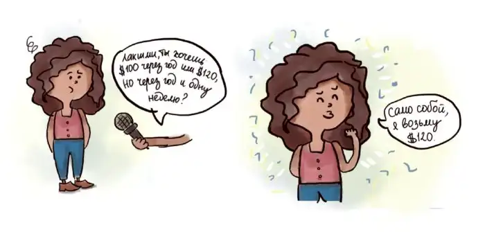 Исследователи провели классический эксперимент, который наглядно демонстрирует описываемое явление: получить $100 сегодня или $120 через неделю. Вот как поступает большинство: