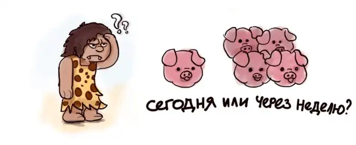 В более суровых условиях мы не знали, доживем ли до ночи, поэтому наш вид эволюционировал таким образом, чтобы совершать мгновенный выбор, который увеличивал шансы передать гены будущим поколениям. Наш ум запрограммирован на предпочтение мгновенной гарантированной выгоды, а не вероятность награды в отдаленном будущем.