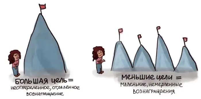 Разбивая большие цели на небольшие задания, вы получаете награду после выполнения каждой маленькой части, а не только в самом конце. Таким образом, вознаграждение становится не возможностью в отдаленном будущем, а немедленным и достижимым уже сейчас.