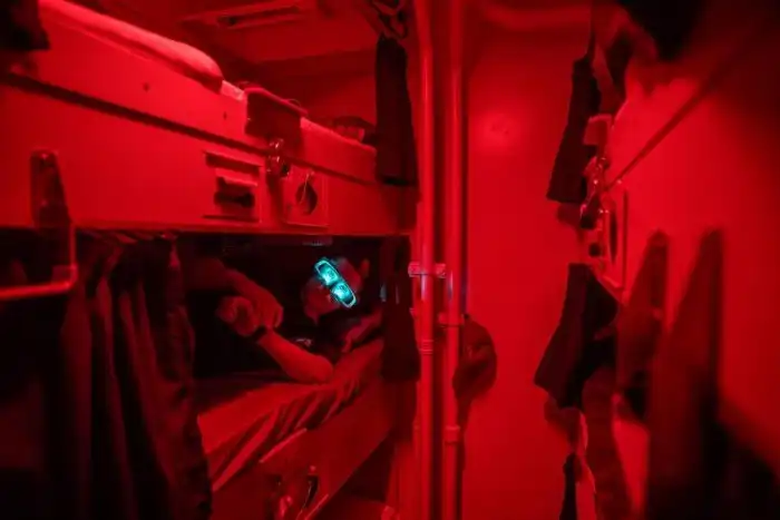 Моряк судна «Пол Гамильтон» лежит на койке в испускающих свет очках: их нужно ненадолго надевать после пробуждения. Нита Шаттук из Военно-морской аспирантуры (Монтерей, Калифорния) тестирует эти устройства, чтобы выяснить, смогут ли они перевести биологические часы моряков и синхронизировать их с расписанием смен, а не с временем суток.