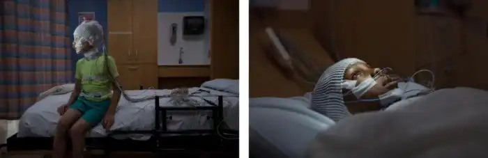 Слева: Сон чрезвычайно важен для здоровья и развития детей. Именно во время сна в теле высвобождается наибольшее количество гормона роста и белков, препятствующих возникновению инфекционных заболеваний. В больнице Национальной системы детского здравоохранения (Вашингтон) восьмилетний Майкл Бозак ожидает начала ночного эксперимента, в ходе которого будет измеряться его мозговая активность. Справа: Опутанный трубками и электродами десятилетний Фрэнсис Аджуа ждет отбоя в детской клинике. Его проверяли на наличие синдрома обструктивного апноэ во сне — повторяющихся остановок дыхания. Плохое качество сна у детей связывают с диабетом, ожирением и пониженной обучаемостью.