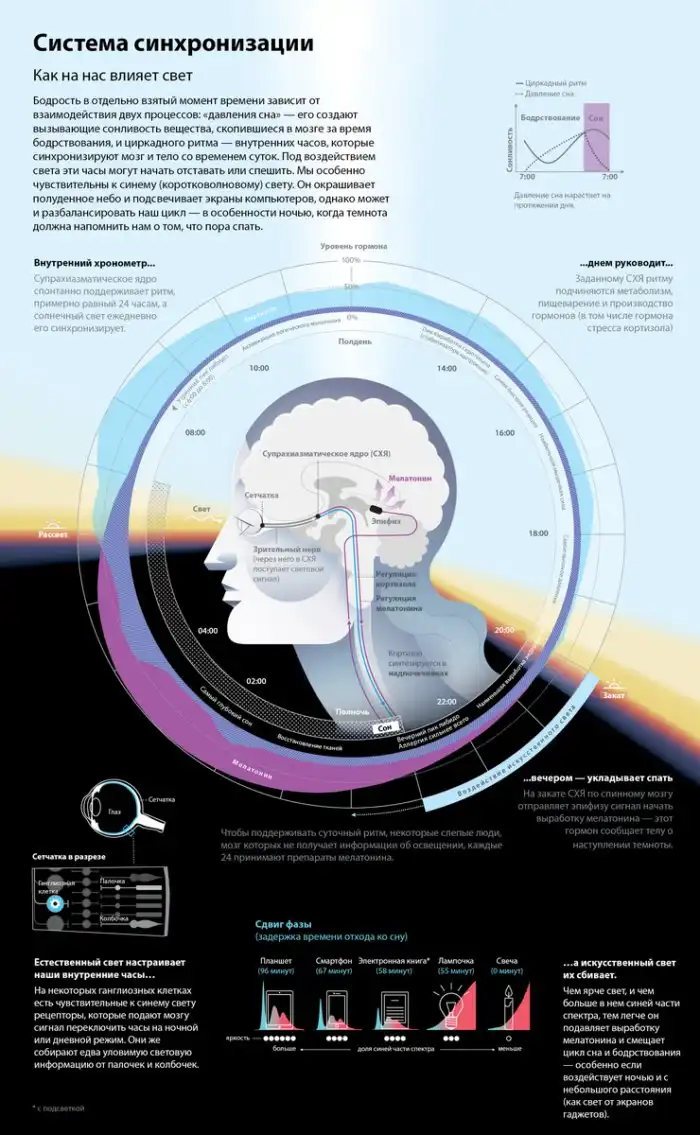 Все, что нам удалось узнать о сне, подчеркивает его важность для нашего психического и физического здоровья. Чередование сна и бодрствования — центральная особенность человеческой биологии, адаптация к жизни на вращающейся планете, к бесконечному круговороту дня и ночи. В 2017-ом Нобелевскую премию по медицине вручили трем ученым, которые в 1980-е и 1990-е годы обнаружили у нас в клетках молекулярные часы, которые синхронизируют ритмы организма со временем суток. Как показали недавние исследования, при нарушениях суточного (циркадного) ритма повышается риск диабета, сердечно-сосудистых заболеваний и деменции.