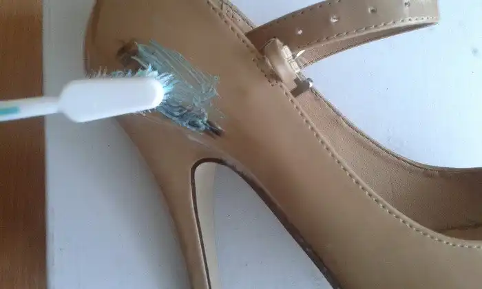 Если на коже образовалась дырка, то ее можно заклеить изнутри суперклеем. Наносить аккуратно зубочисткой на внутреннюю часть обуви, с лицевой стороны это место следует придержать чистой тряпкой, чтобы клей не вытек наружу. Для высыхания достаточно двух минут, слои кожи, которые склеиваются, при этом крепко прижимайте друг к другу. Когда все будет готово, закрасьте краской для обуви пострадавшее место.