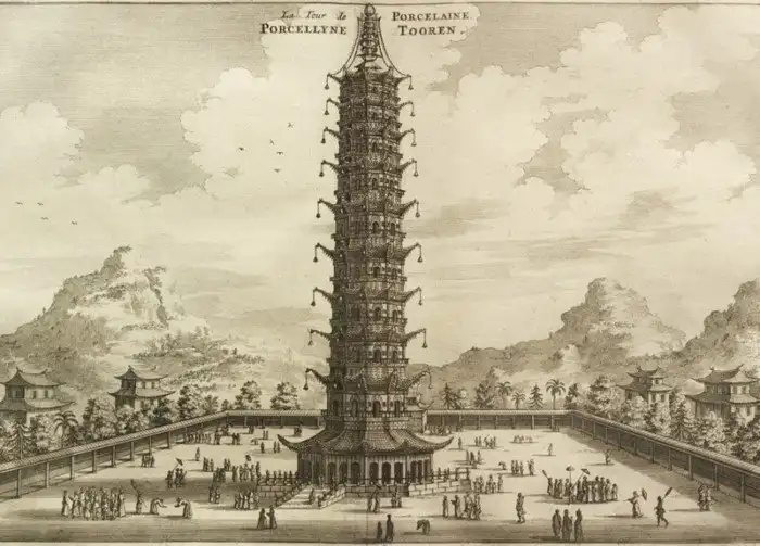 Буддийский храм в Нанкине был возведен во времена китайской династии Мин. Восьмигранная 78-метровая пагода была сложена из белого «фарфорового» кирпича. Наряду с Тяньцзе и Лингу, во времена династии Мин сооружение считалось одним из трех знаменитых храмов города, а европейские путешественники называли башню одним из главных чудес Китая. В 1801 году три верхних яруса башни были повреждены ударом молнии. Храм восстановили, но в 1856 году строение снесли тайпины, опасавшиеся, что враги могут использовать башню в качестве наблюдательного пункта.