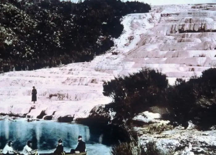 Террасы на озере Ротомахана долгое время считались одним из чудес природы Новой Зеландии. Террасы сформировали горячие геотермальные воды, ниспадавшие по склону холма. Вода оставляла слои кремнезема, который впоследствии и образовал террасы. В 1886 году в результате извержения вулкана Таравера террасы были разрушены. На месте террас образовался кратер глубиной более 100 метров, со временем превратившийся в новое озеро Ротомахана.
