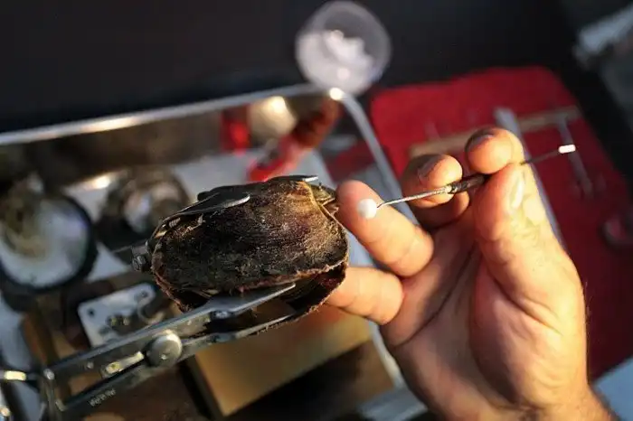 В начале 20 века добытчик жемчуга из Японии раскрыл заветную тайну рождения жемчужин и придумал способ искусственного добывания драгоценностей. Он понял, что во взрослого моллюска можно насильно вживить инородное тело (иногда получается подсадить сразу несколько). Жемчуг, произведенный таким способом, проходит строгую проверку и детальный осмотр (контроль качества). Проверку проводят для того, чтобы толщина перламутра была точно такой же, как у жемчужины, полученной естественным путем.