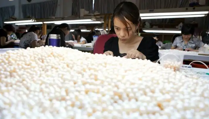 Рабочие на китайской фабрике по производству украшений из жемчуга.