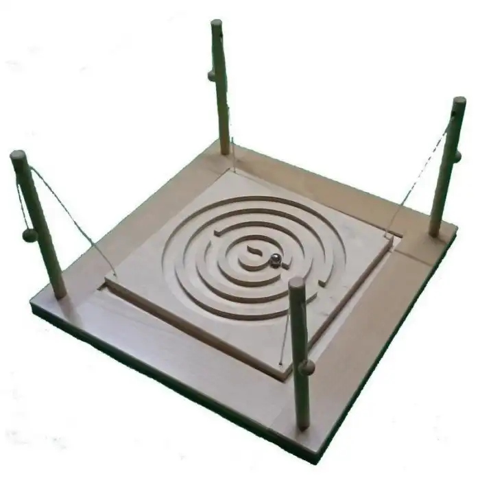 И снова закати шарик - участники становятся с двух сторон, тянут висящую плоскость веревочками - надо закатить шарик в центр быстрее второго игрока