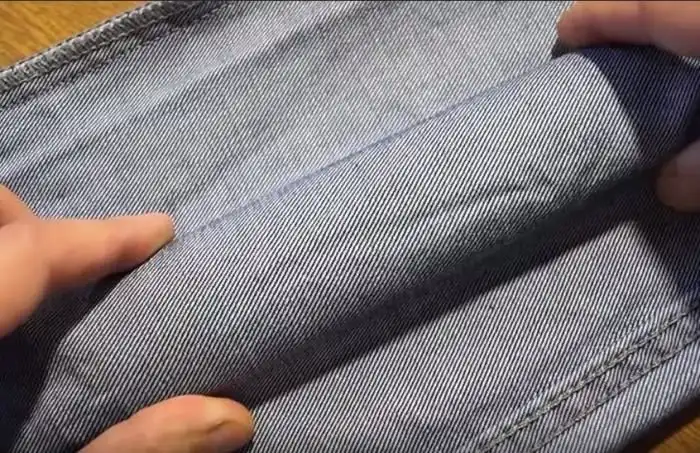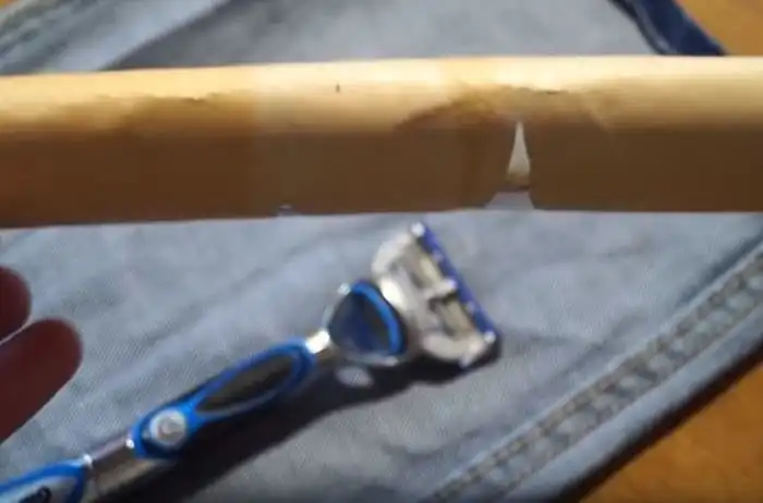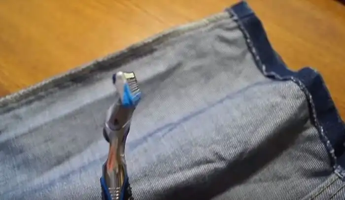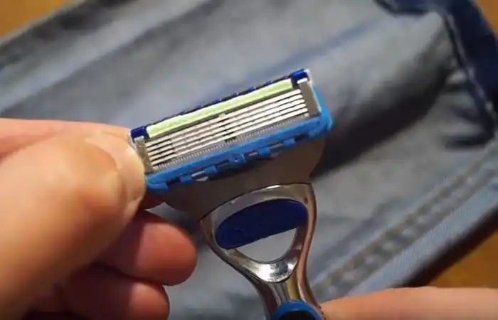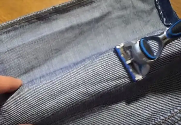 Дальше все очень просто. Водим по получившемуся бугорку бритвой. Направление станка должно быть противоположным движению, которое совершается в момент бритья. Для достижения идеально заточки нужно сделать 100-150 движений. Важно, менять направление движения на 180 градусов, после совершения каждых 50 движений. Это нужно для того, чтобы не случилось «привыкание» ткани, и ворсинки джинсов не загибались в одну сторону.