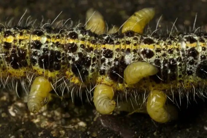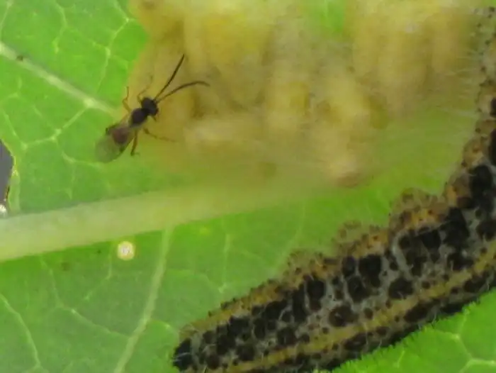 Процесс закладки яиц на яйца паразитов гусеницы, осой поменьше: