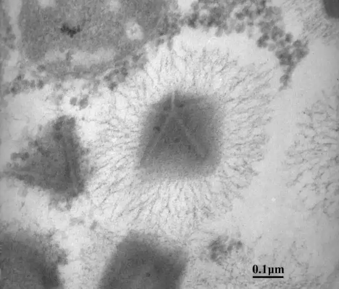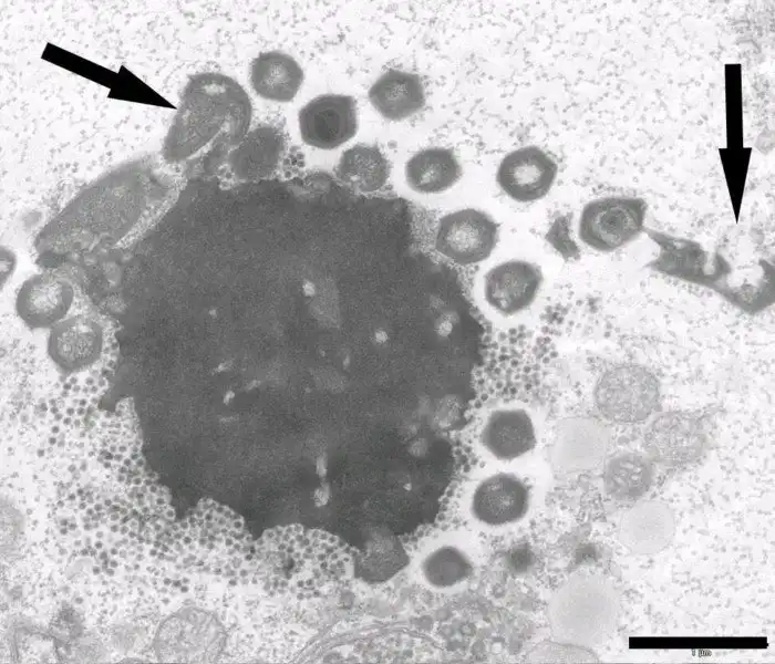 Фотография на которой мимивирусы, в сопровождении вирофагов атакуют амёбу: