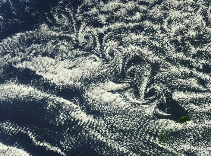 В любом случае поток, натыкаясь на цилиндр, обогнув его начинает формировать цепочку вихрей, срывающихся поочередно с разных сторон объекта. Природа подарила нам множество примеров титанического масштаба, позволив наблюдать его на облаках, обтекающих горы или острова в океане. Явления иногда настолько масштабны, что их видно из космоса.