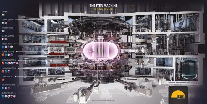 Впервые схему термоядерного реактора предложил еще Игорь Евгеньевич Тамм в далеком 1938 году, но дальше теории дело не пошло. Раскаленную плазму нужно удерживать в магнитном поле, так как ни один материал просто не выдержит настолько высоких температур. Для создания сверхмощного магнитного поля проводники будут охлаждаться до -270°С, при этом внутри реактора температура плазмы будет достигать примерно 100 000 000 °С.