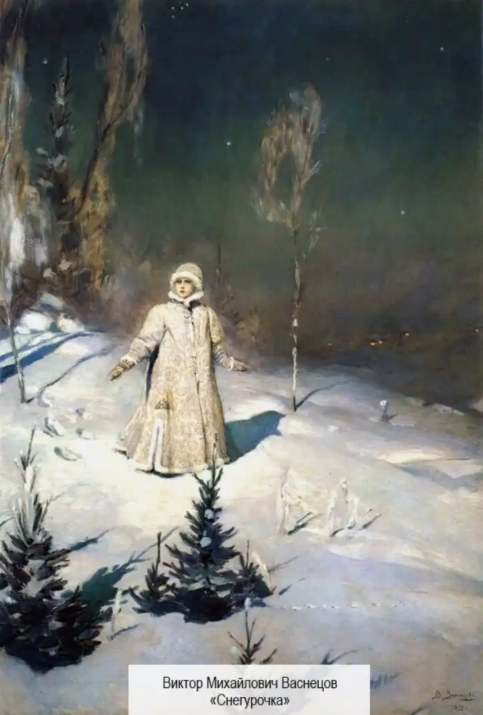 Согласно легенде, у одной семьи не было детей. Долго они кручинились, а потом решили пойти во двор и вылепить из снега девочку для утешения души. Волшебные силы, возможно, услышали мольбы семейной пары, а потому под руками их оживили Снегурочку. Увы, концовка у этой истории трагическая, поскольку снежная девочка тает от тепла пламени. Мне кажется, именно такая трактовка её образа подчёркивает хрупкость красоты и зимнего очарования.