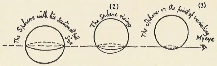 Непостижимая Квадратом тайна третьего измерения на примере прохождения сферы через плоскость. Герой наблюдает уменьшение Окружности до точки и её исчезновение.