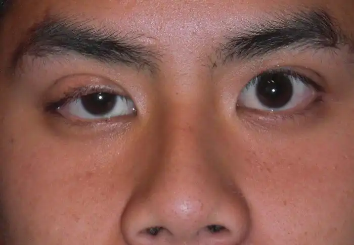 На фотографии изображён птоз - непроизвольное опускание век. Один из симптомов. Но начинается всё куда прозаичней. Рвота и понос как следствие первой реакции и токсинемии. Затем, самыми первыми отключаются мышцы жкт, начинается парез (ослабление) и, как следствие, запор и бурное газообразование. Отравление ботулотоксином от обычного бодрящего поноса или пищевого отравления сосиской в тесте отличает одновременное появление неврологических симптомов. Расстройство зрения: всё плывёт, сетка, туман, двоение. Сухость во рту и общая мышечная слабость. Затем отказывают мышцы лица. Оно становится похожим на маску. В этот момент и может появится птоз, подрагивание зрачков, косоглазие. Зрачки перестают реагировать на свет, могут стать разного размера. Становится сложно управлять языком, мышцами головы и шеи, становится сложно держать голову. Говорить и ходить. Дальше всё сильно варьируется от того, сколько именно вы успели съесть и как быстро вам окажут медицинскую помощь.