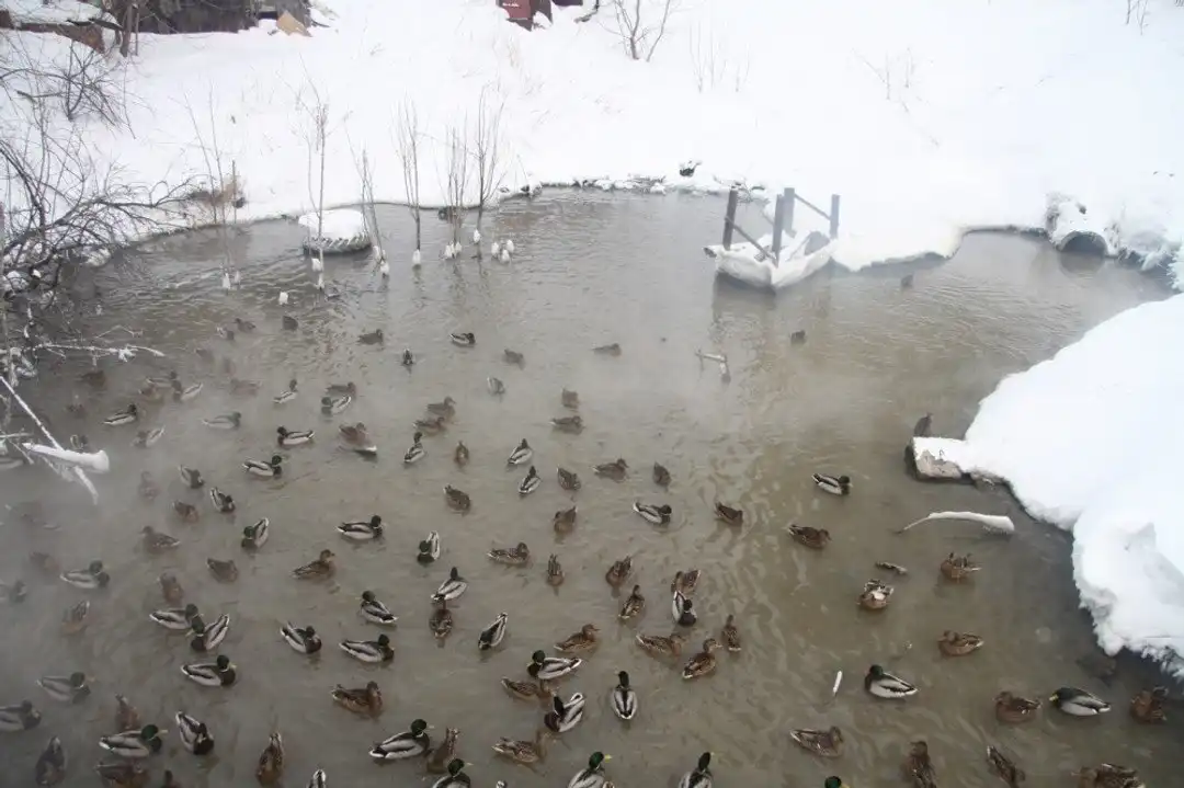 Секрет водоема прост — в него сливается горячая вода от близлежащих домов. По словам местных жителей, птицы живут здесь круглый год уже около пяти лет. Агрессии птицы не проявляют, а питаются тем, чем накормят горожане.
