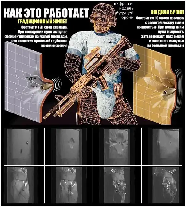 Принцип работы геля незатейлив. Когда пуля врезается в ткань с жидкой броней, частицы геля под воздействием кинетической энергии моментально связываются между собой и останавливают пулю. При этом пуля не разрушается, не рикошетит, она - моментально вязнет. Её огромная кинетическая энергия поглощается и рассеивается.