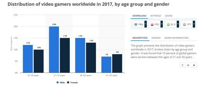 Если кто-решит польстить мне тем, что мой контент уж больно взрослый, да ещё и часто ударяющийся в ностальгию, следовательно аудиторию этого канала нельзя считать достоверным статистическим срезом, то и тут подоспеют не менее солидные аргументы. Например, многим известный портал сбора статистических данных Statista проводил исследование среднего возраста и пола игроков за 2017 год, и его результаты не сильно отличаются от показателей по моему маленькому игровому блогу. Кроме того, результаты исследования Statista относительно пола игроков удивили даже меня – я всегда считал, что геймеров мужчин гораздо больше, чем женщин, ан нет – почти поровну.