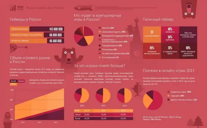 Ну да что нам эти американцы, у нас ведь другой менталитет, привычки и "традиционные ценности", так? Нет, нет так. Ещё в 2014 году электронный платёжный сервис RBK Money провёл масштабное исследования рынка электронных развлечений в России и кроме различных финансовых показателей, попутно выяснил и интересующий нас средний возраст отечественного геймера – 33 года. Результаты исследования получились весьма занятными, да и оформили их приятно – рекомендую немного позалипать.