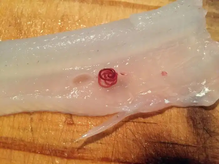 Анизакидоз заболевание неприятное, классический способ приобретения - кушать слабосолёную селедочку. Паразиты-нематодозы семейства Anisakidae вызывающие его похожи на аскарид, только гораздо меньше, это круглые черви размером 4-6 см. Вы наверняка видели их, если и не за столом, то точно в интернете, это как раз те самые "забавные" спиральки, которые находятся как в мышцах так и в полостях тела рыбы. Сложный цикл размножения включает выбрасывание яиц в морскую воду, затем их обычно проглатывает пара видов креветок, затем креветок жрёт неосмотрительная селёдка или кальмар, а иногда и тот и другой. А затем их ловит траулер из Мурманска, Осло или Осаки. Заражённая рыба не умирает и особо не страдает, она играет роль бесплатного автобуса. Попав в её кишечник паразиты забираются в мясо, разрастаются до привычных спиралек, капсулируются в спячку и ждут.