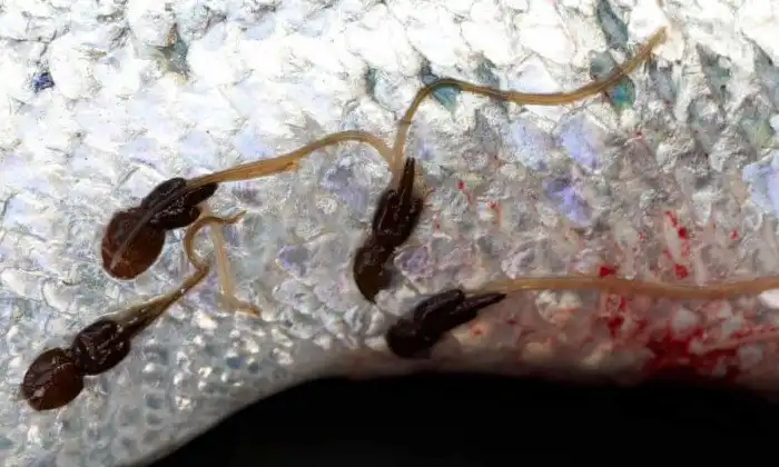 В интернете например очень популярны фото и видео морских вшей/лососевых вшей, перевод варьируется, но речь идёт про Lepeophtheirus salmonis, род вшей Калигус. Сами по себе они не опасны для вас, но переносят опасные вирусные заболевания и вызывают массовый падёж рыбы в местах разведения, заставляя рыбные хозяйства использовать высокие концентрации химических веществ. Морские вши питаются слизью, кровью и иногда чешуей рыб. Только для лососевых выделяют несколько десятков видов. Выглядит это иногда так отвратно, что если вы поймаете такую форель, то скорей всего забросите рыбу обратно в воду, вместе с удочкой, а то и рыбалкой на пару лет, а может и навсегда.