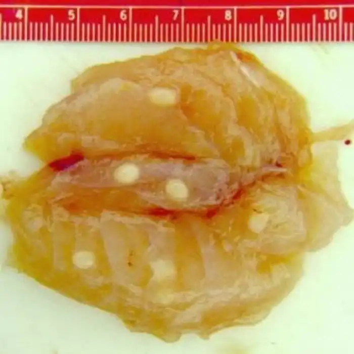 Или, например беспозвоночные паразиты класса Myxozoa. Найти можно прямо в мясе в виде белёсых цист. Внутри цисты жидкость цвета сливок. Вот такая.