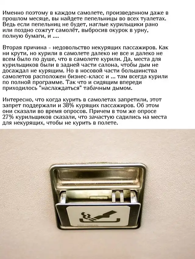 Если поискать ответ на этот вопрос в поисковиках, то среди первых высвечивается причина: во избежание пожара. Но до введения запрета не было зафиксировано ни одного пожара на борту самолета по причине курения.