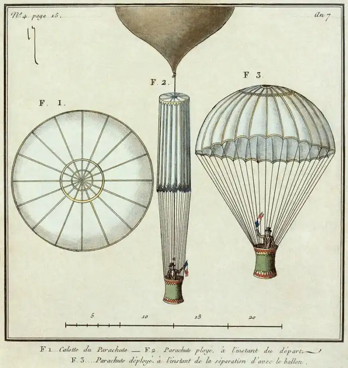 В 16-17 веках никакой практической надобности в парашютах для человечества не было. Надобность в подобном изделии возникла вместе с началом эры воздухоплавания. В 1783 году в воздух поднялся первый монгольфьер, а французский механик Луи Ленорман (незнакомый с работами да Винчи и Веранцио) предложил свой вариант парашюта.