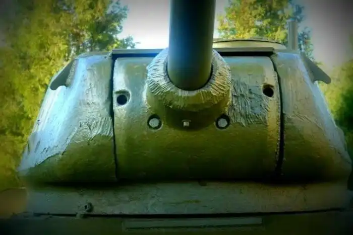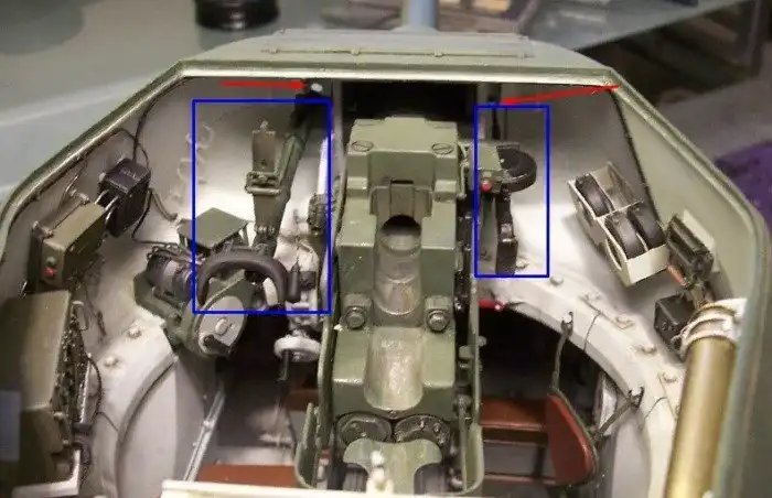 Итак, что же мы видим? Слева от казённика пушки находится телескопический прицел наводчика-оператора, который расположен аккурат напротив одного из отверстий. Что находится справа - непонятно, однако 4 диска для пулемета ДТ-29 наталкивают на определенные предположения.