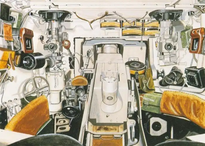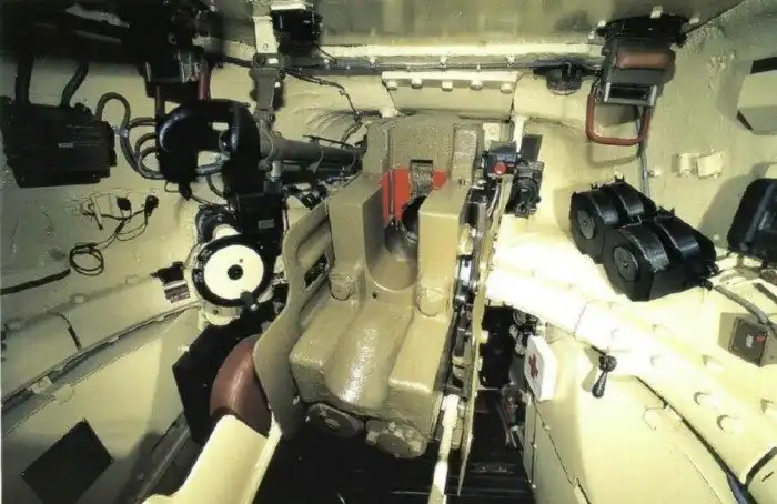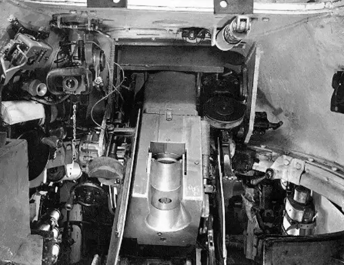 Башня танка КВ-1 изнутри. Видим аналогичную компоновку. Слева от пушки находится прицел наводчика, справа - пулемет.