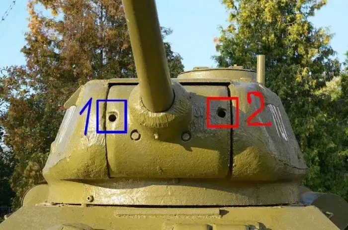 Второй же пулемет является спаренным с орудием и находится справа от него (если смотреть изнутри). Именно для пулемета и предназначено отверстие номер 1!