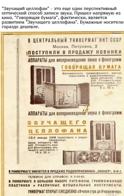 Если вы считаете, что развитие аудиотехники имело лишь только один путь развития, то вы ошибаетесь. Вместо использования магнитной ленты, также существовал способ записи на бумажную ленту, считывание с которой производилось при помощи фотоэлемента. Подобные записи можно было копировать типографским способом, причем, без потери качества. Итак, читаем далее, что же такое "Говорящая бумага" времен СССР.