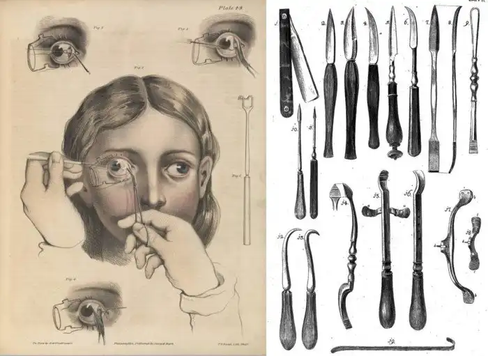 Пособие по глазным операциям и набор инструментов 18-го века:
