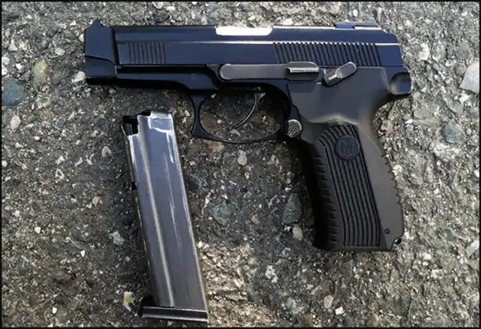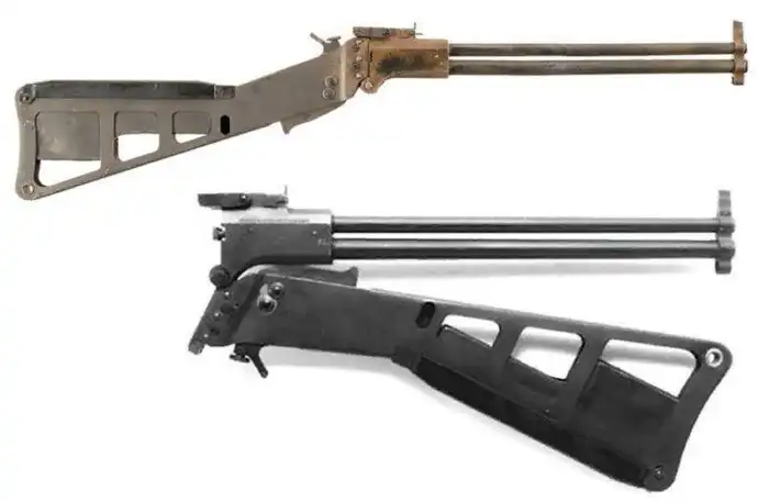 Этакий симбиоз странной формы получился - трехствольный пистолет с двумя гладкими стволами и одним нарезным. По сути, это обрез трехствольного охотничьего ружья - вверху, как я уже говорил два гладких ствола под патрон 12,5х70 миллиметров (предусмотрены дробовые и сигнальные боеприпасы). Снизу — нарезной ствол, калибра 5,45 миллиметра под патрон с экспансивной пулей с начальной скоростью пули 1117 метров в секунду. Поражающее воздействие такого патрона в 8-10 раз превосходило показатели обычного 5,45 мм автоматного патрона. Дальность эффективной стрельбы оказалась: 40 метров дробью и 200 метров пулей.