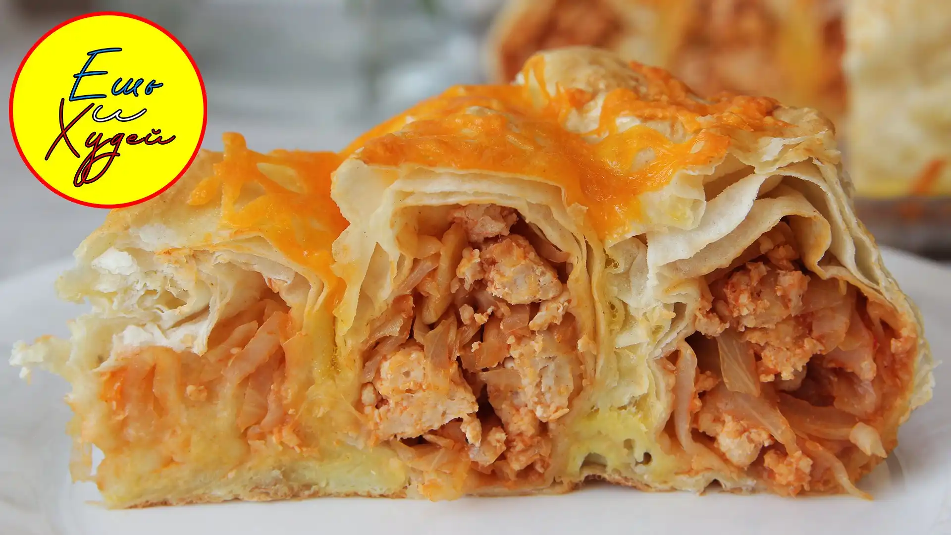 Простой и очень вкусный пирог из лаваша с капустой и куриным фаршем. Всего 140 калорий на 100 грамм!